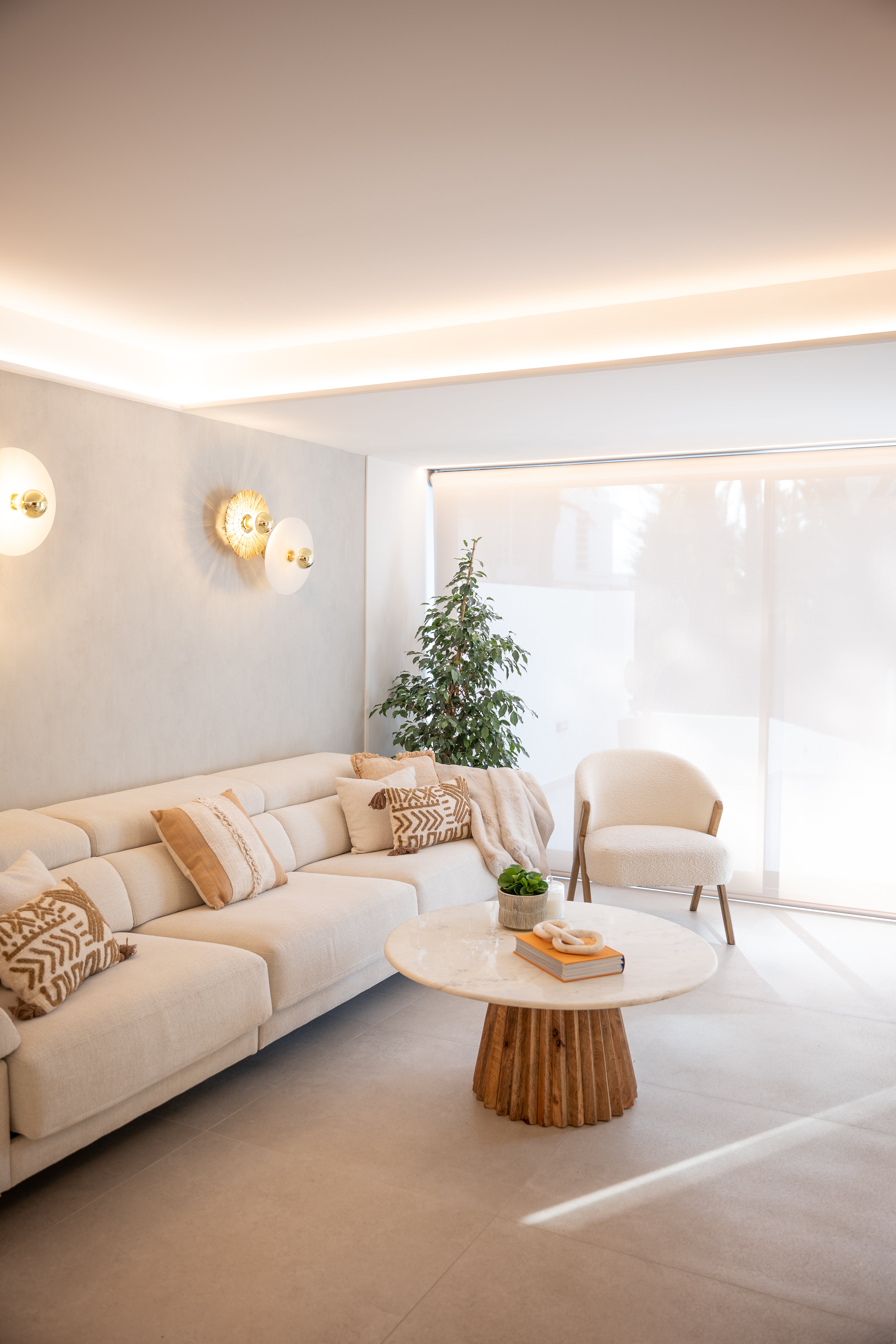 En esta vivienda de Gavà Mar instalamos estores enrollables motorizados en toda la casa —salón, cocina y dormitorios— para unificar estética y funcionalidad. Elegimos un tejido screen 5% en tonos beige, que permite mantener la conexión visual con el exterior sin renunciar a la privacidad durante el día.