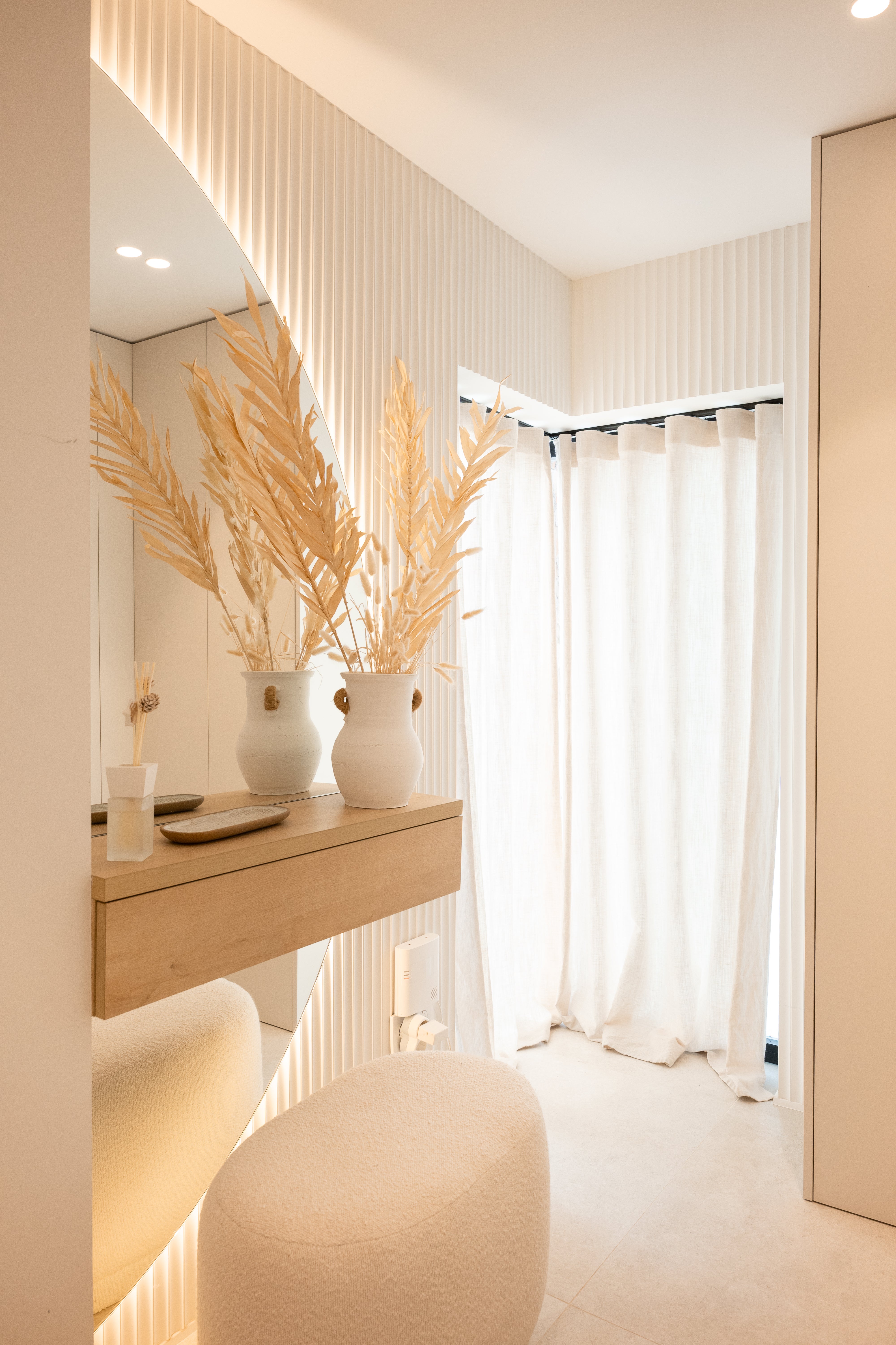 Además, colocamos una cortina plisada de lino en el recibidor, aportando calidez y textura al espacio, y un sistema minibox con tejido blackout en la puerta de la cocina, ideal para garantizar una mayor intimidad cuando se necesita.